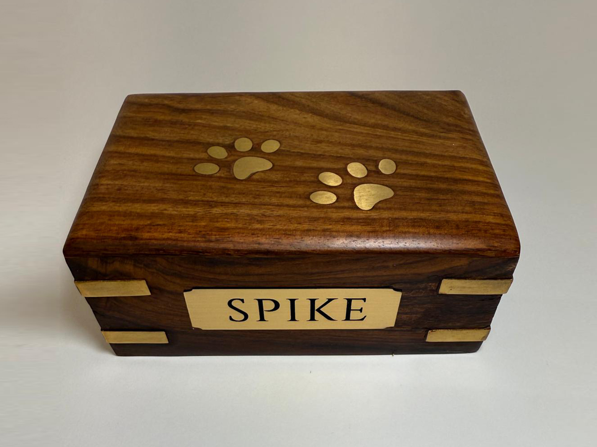 This rosewood urn features brass paw prints as well as brass brackets at each corner and a gold personalized nameplate providing a handsome rustic look to this beautiful urn. Can hold all sizes up to 115 lbs.