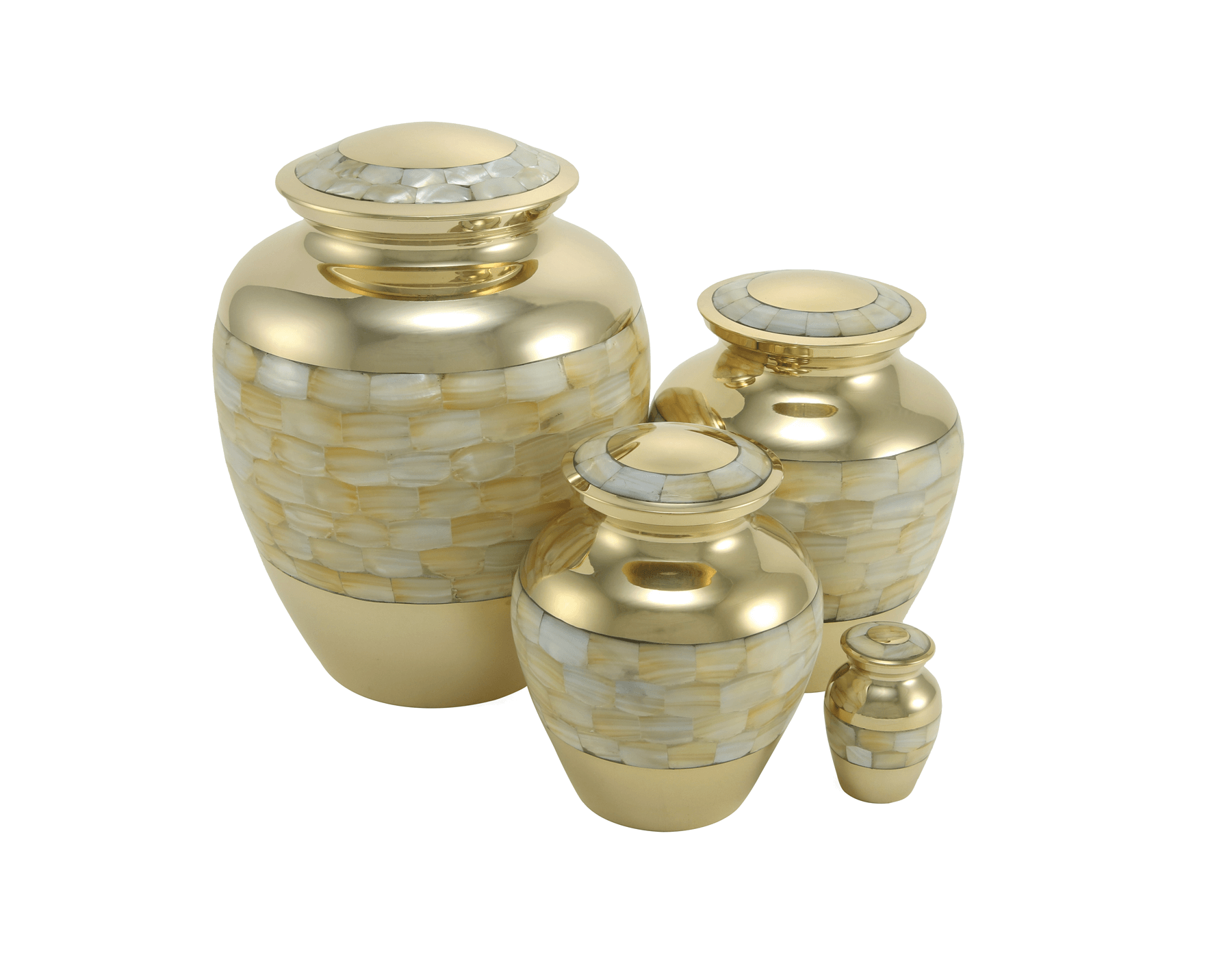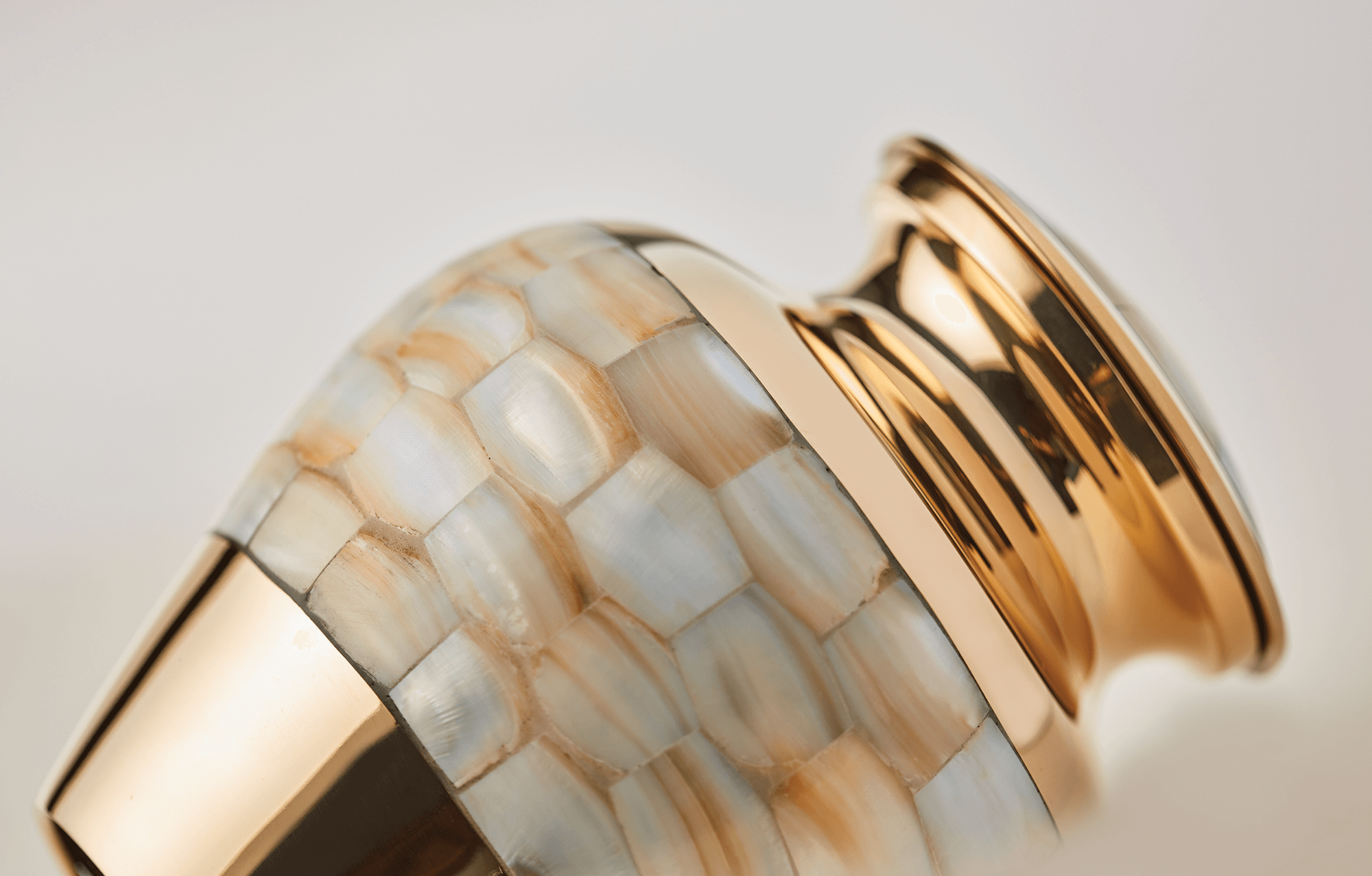 Hand-cut pieces of shining pearl are hand inlaid one at a time onto this gorgeous Mother of Pearl pet urn. Gold trim accentuates the pearl beautifully. It is one of the most elegant pieces from our collection of handcrafted urns.